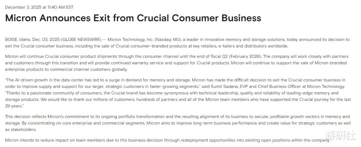 12 月 4 日,美光科技正式发布声明,旗下拥有 29 年历史的消费级品牌 “英睿达(Crucial)” 将彻底退出市场。作为全球第三大内存厂商,美光与三星、SK 海力士联手垄断了 92% 的全球内存市场,这次主动离场直接在消费级存储市场撕开一道供应缺口,让本就深陷涨价潮的 PC 玩家们雪上加霜。